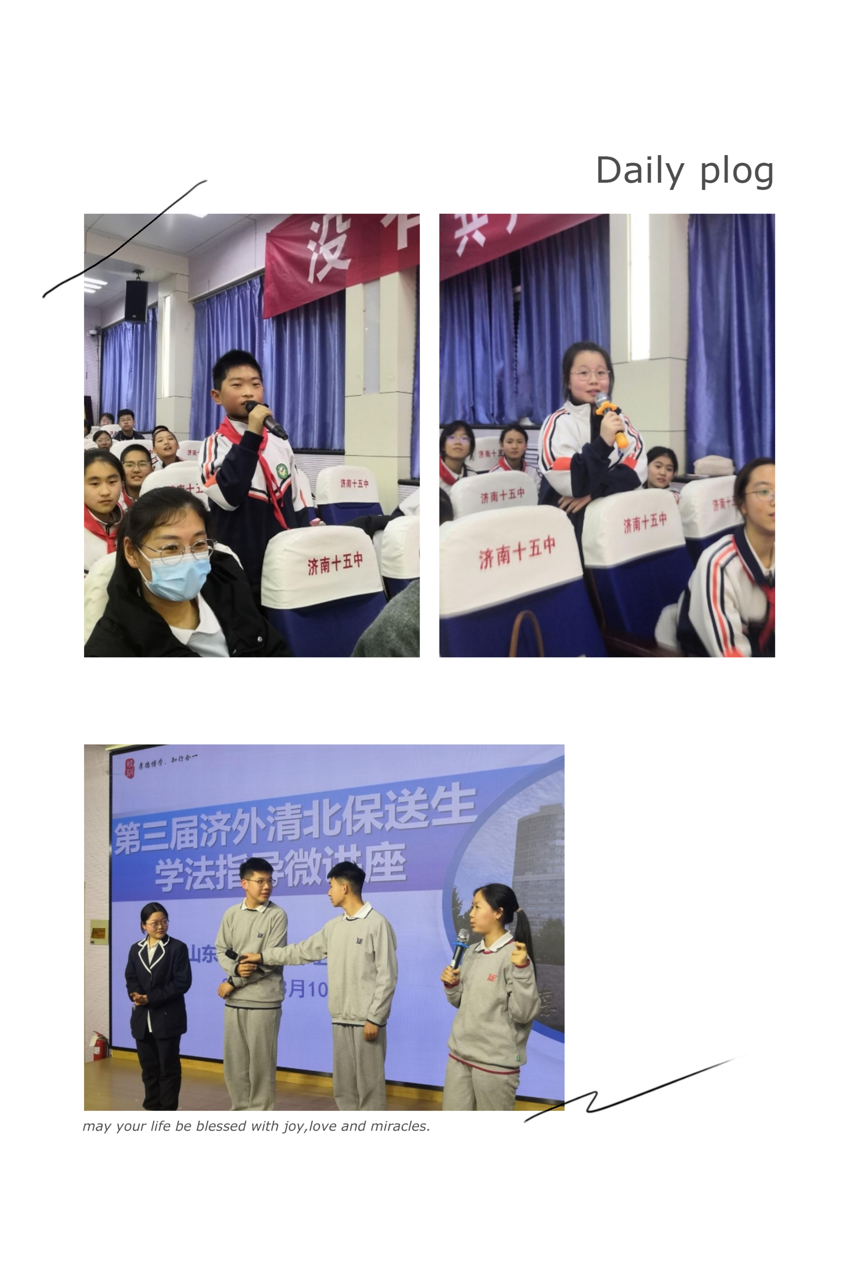 曲骊安同学强调了心态最重要,时常分析自己的成绩,制定下一步的学习任务,多请教老师,适当的放松,与同学多愉快交流,多在操场活动如跑步,不要给自己过重压力,而是要想办法缓解压力等学习和生活方面分享了自己的学习方法和经验。