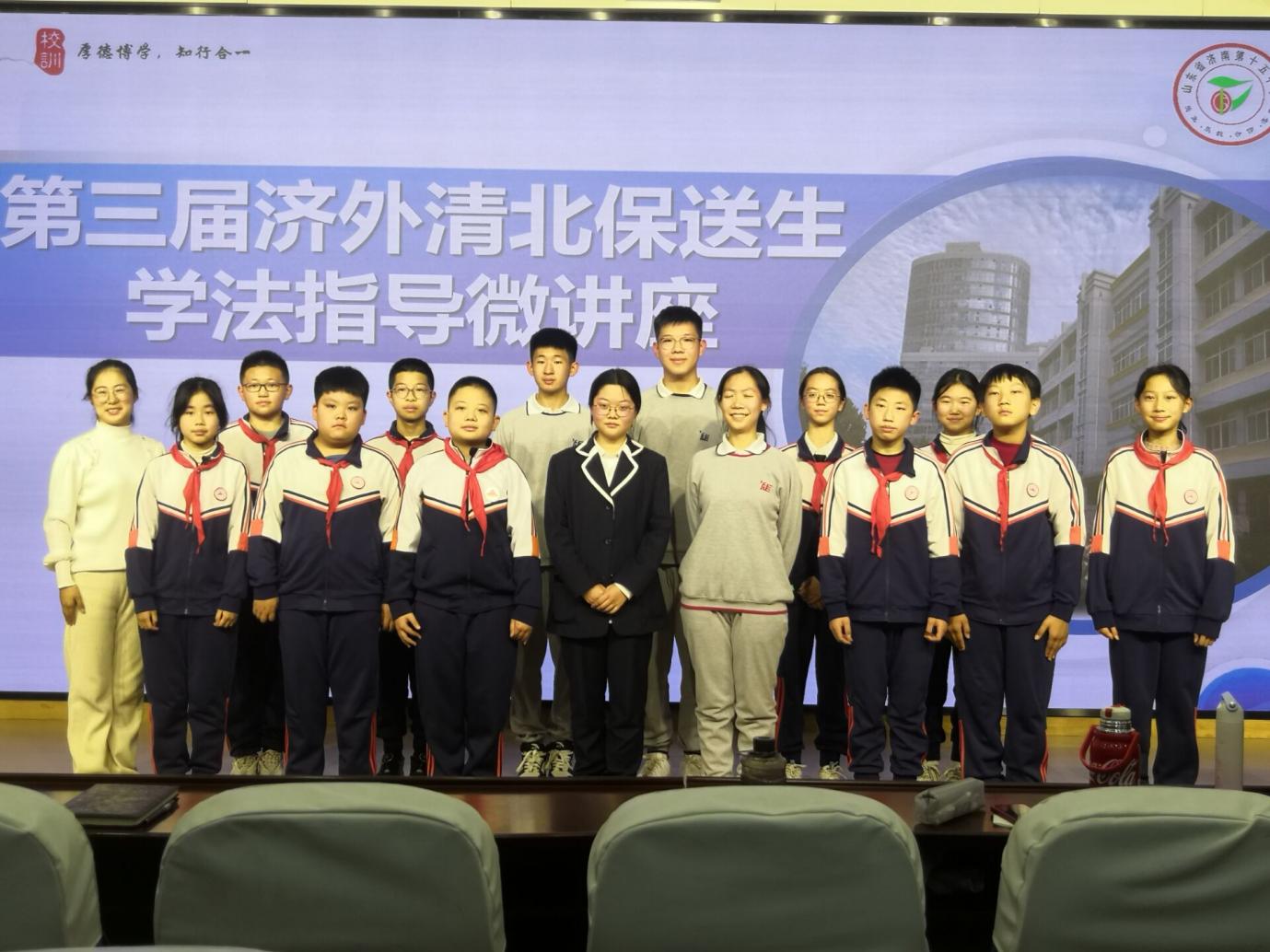 学校领导向济南外国语学校四位优秀学子表示感谢,并与会三位优秀学子合影留念,小学师生也与与三位优秀学子合影留念。 此次第三届济外保送生学法指导微讲座活动,为我校和对口小学师生带来了宝贵的学习经验、生活经验及心理调节妙法的分享,极大地激励了学生们积极向上的精神状态,进一步借鉴和优化了学习方法,调节和保持健康开朗乐观的心态,有步骤有计划的提升素养,增强了我校和济外集团校、对口小学的学生“高-中-小”的衔接教育。通过这次优秀生交流展示,榜样的力量激励着学生们奋发有为“强国有我”的情怀,促进了“优质均衡”的高质量教育发展共享,现场非常热烈,取得了理想的效果。