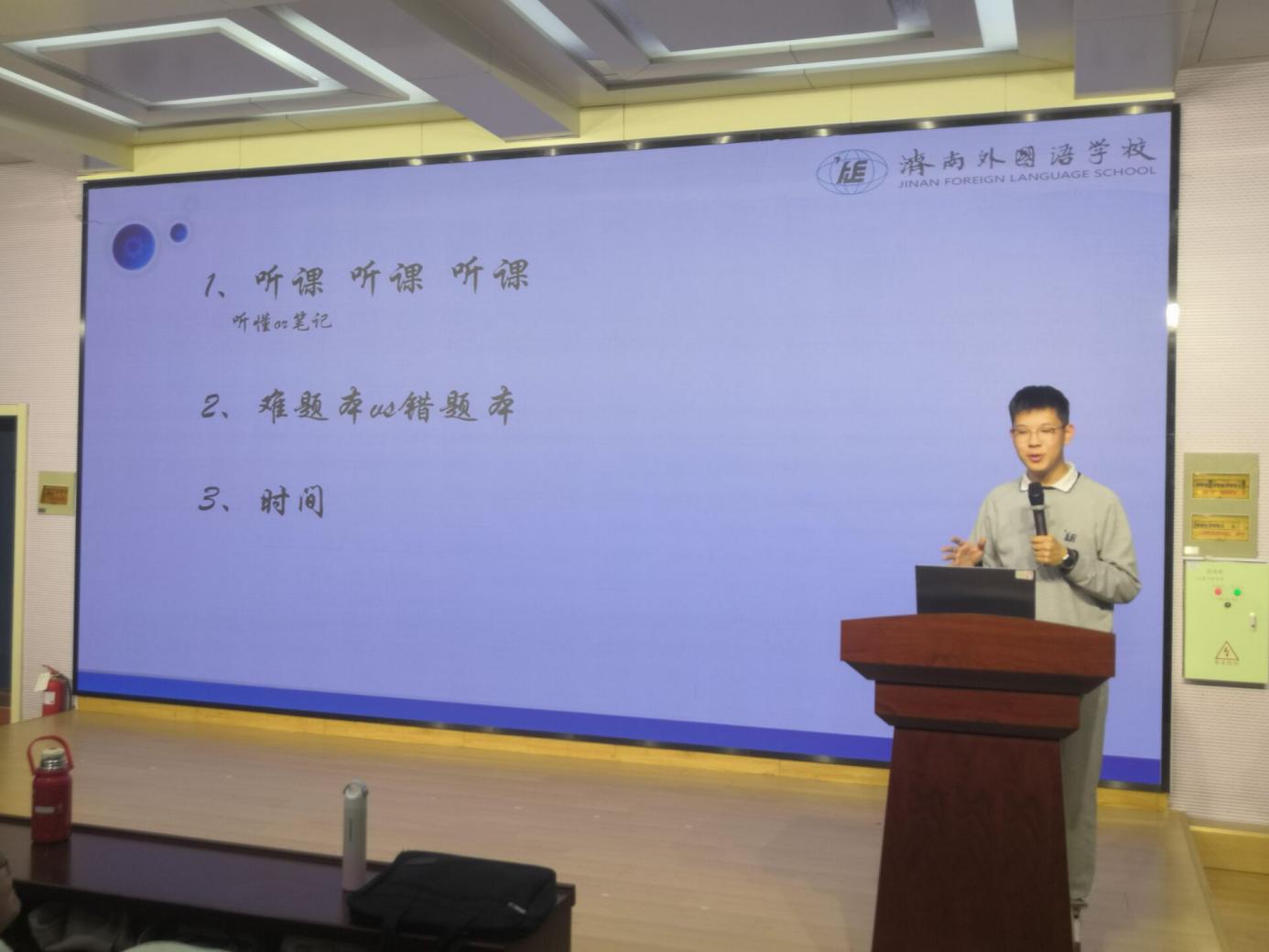 张宸硕同学强调了听课的重要性、难题本和错题本的整理,时间的分配等,他强调了关键是调节好自己的情绪状态,积极阳光的心态,多进行体育活动,激发自己积极的学习,并分享了自己在预习、阅读、参加竞赛活动等方面的心得。