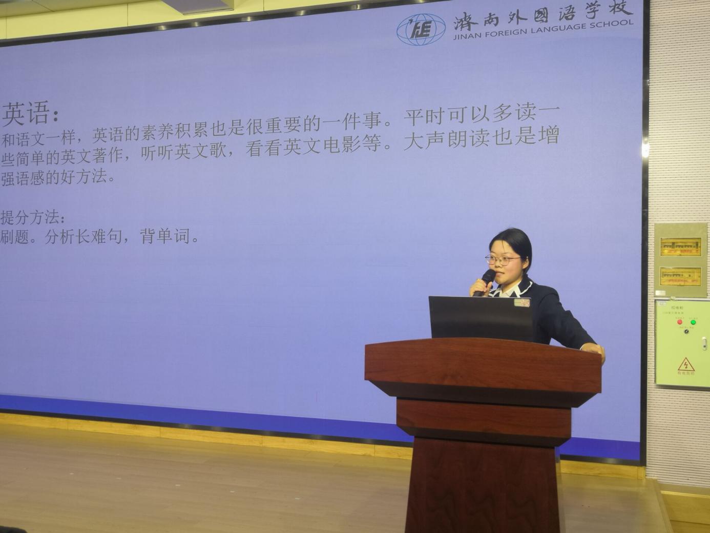 朱怡婷分享了语文、数学、英语的学习策略,注重素养积累,阅读能力与阅读书目的数量是密不可分的,提分方法就是用心思考,多问几个为什么要这样思考,要分这几条,要这样作答,多听英文歌,看看英文电影,大声朗读,增强语感。